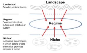 Transition management assumes that regimes function with an evolutionary logic, filtering out unsuccessful experiments and gradually selecting useful innovations and integrating them into their existing practices. Niches are safe environments in which such innovations can grow, protected from the selection process. The pressure from the landscape is the key factor in how receptive (or susceptible) the regime is to niche innovations (will the innovation complement, repair, titillate or disrupt the regime?). Moments of high receptivity are windows of opportunity in which radical innovations can become drivers of change. If they accumulate to a critical mass and are aligned across different subsystems, they can transform or even replace the regime (F. W. Geels, J. Schot / Research Policy 36 (2007) 399-417).