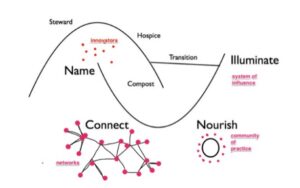 Another map of system change that fits with the guerrilla gardening idea is the Two Loops model developed by Margaret Wheatley and Deborah Frieze at the Berkana Institute. The model describes the dynamics and roles involved in the transition from one system (in transition management terms: a „regime“) to another. Wheatley and Frieze assume that all systems go through a build-up phase, a peak phase and a decline phase - in larger social systems this may happen over a period of 250 years, while in organisations episodes that are characterised by a certain paradigm may only last a few years. Picture: Berkana Institute