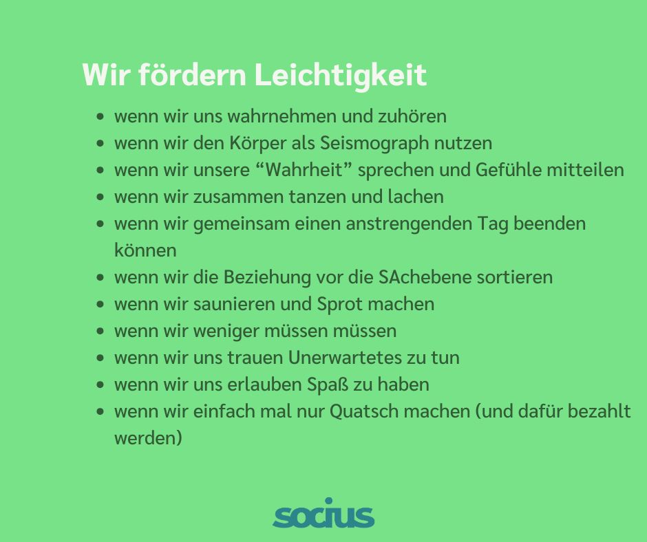 Wir spüren Leichtigkeit, wenn wir tief atmen können, unser Körper entspannt ist, wir vor Freude sprudeln, wir kichern vor Auf- oder Anregung, uns ein Lächeln auf den Lippen liegt, wir den Überblick über die aktuelle Situation haben, wir gemeinsam in den flow kommen.