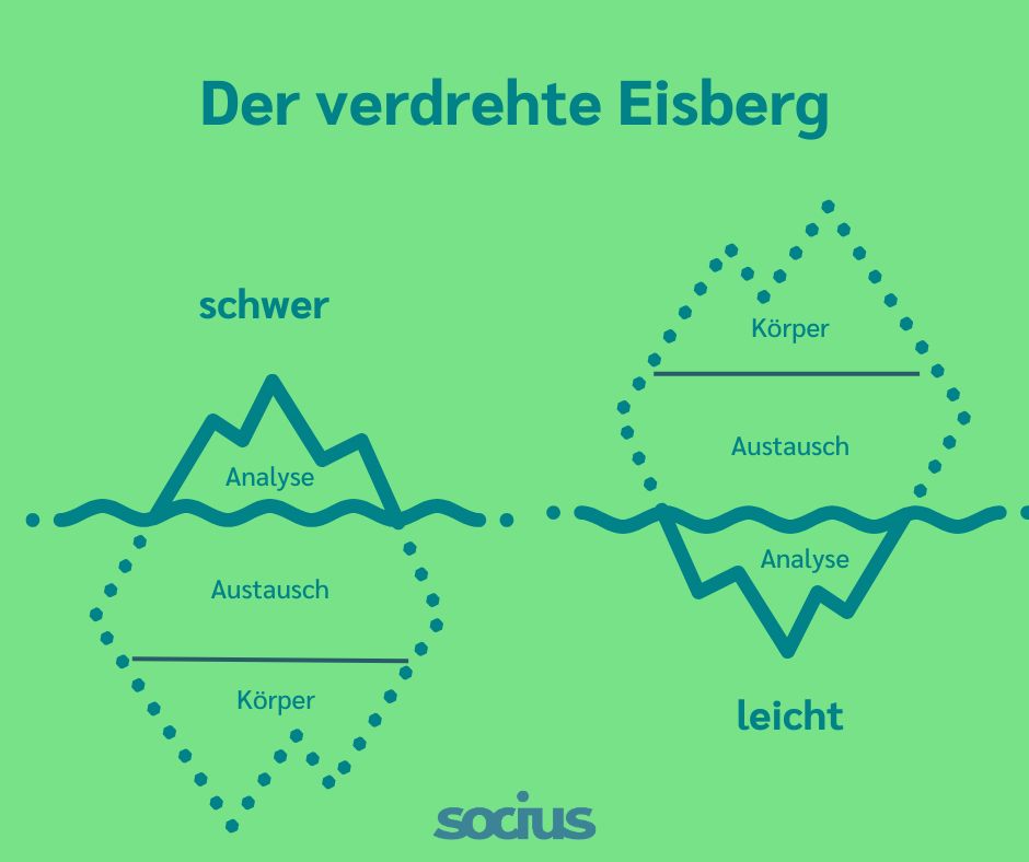 Die Idee von Hannah und Lea den allseits bekannten Eisberg einmal umzudrehen und die somatischen Reaktionen verbalisiert weit aus dem Wasser ragen zu lassen und die Analyse der Situation etwas unter die Oberfläche verschwinden zu lassen, fanden wir alle so interessant, dass sich eine lebhafte Diskussion entspann, was hier noch weiter zu beachten und zu verändern sein könnte.